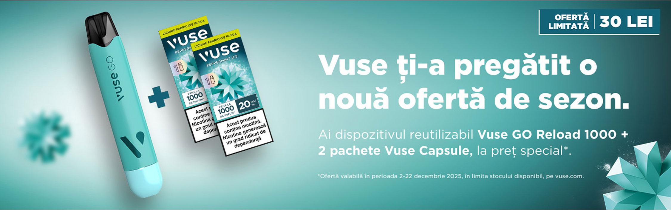 Dispozitivele Vuse Go sunt destinate exclusiv consumatorilor peste 18 ani. Acestea nu sunt potrivite persoanelor alergice/sensibile la nicotină (în cazul țigaretelor electronice Vuse Go cu nicotină) sau la oricare dintre ingredientele enumerate pe ambalaj, femeilor însărcinate sau care alăptează, persoanelor care ar trebui să evite produsele din tutun sau nicotină (în cazul țigaretelor electronice Vuse Go cu nicotină) din motive medicale, persoanelor cu probleme cardiace, hipertensiune arterială severă sau diabet. Nu lăsa produsele Vuse Go la îndemâna copiilor și a animalelor de companie.